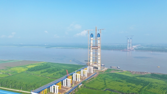 4月24日,中交路建承建的湖北省最大跨徑雙主纜八車道懸索橋——漢南長江大橋南岸主塔中橫樑混凝土澆築工作順利完成。